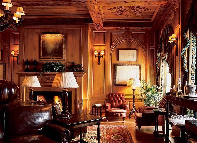 Стены обычно оклеивают однотонными, или с чуть видным рисунком, обоями. При наличии достаточной площади помещения и финансовой базы стены можно облицевать деревянными панелями с резными элементами – особенно уместно они смотрятся в рабочих кабинетах как фон для книжных шкафов и кожаных диванов, свидетельствуя о серьезности намерений хозяина.