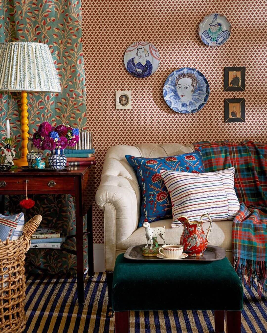 - Текстиль преимущественно натуральный. Англичане предпочитают однотонную материю или украшенную полоской, клеткой, мелким орнаментом.