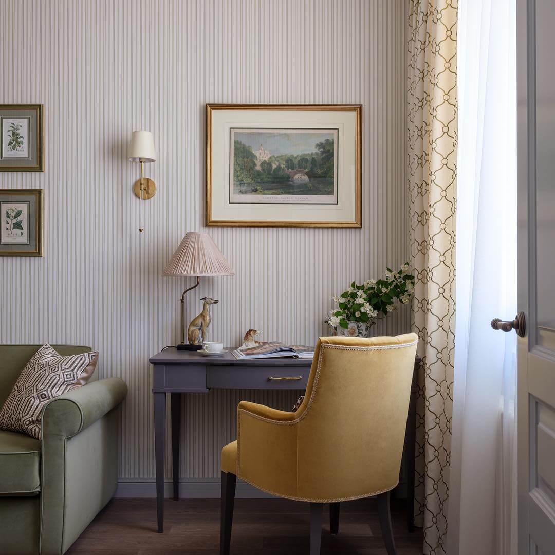 - Для отделки помещений в английском доме используют древесину, натуральный камень, обои с растительным орнаментом или с полосатым принтом.