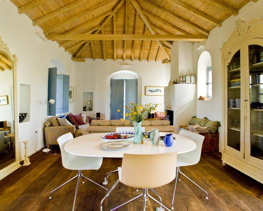 Если есть желание оформить интерьер в более современном греческом стиле, допустимо декорирование потолков балками.