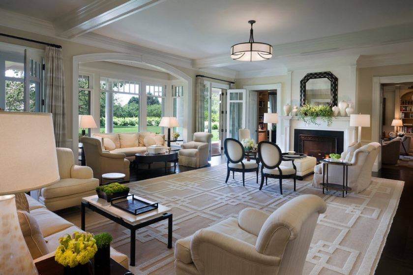 Ковры на пол не укладываются, чтобы не скрывать красоту мраморной мозаики, фактуры натурального дерева. Однако если в качестве напольного покрытия был использован однотонный материал, то для имитации мозаичного пола допускается положить ковер с соответствующим орнаментом, называемым меандр.
