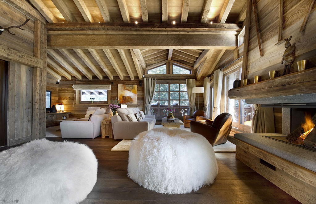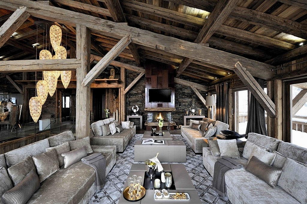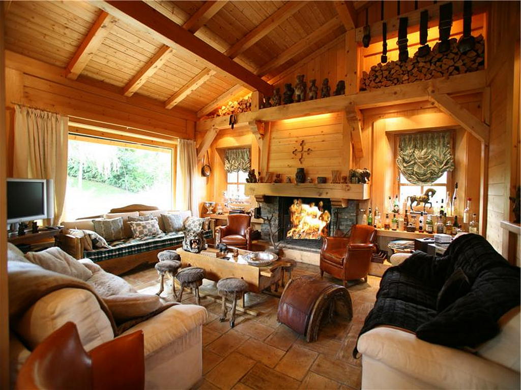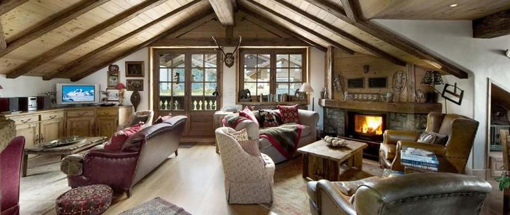 На фоне искусственно состаренных деревянных и каменных поверхностей смотрится необычно. Подобные дизайнерские решения могут быть применены в любой комнате. Наиболее характерны они для гостиной шале.