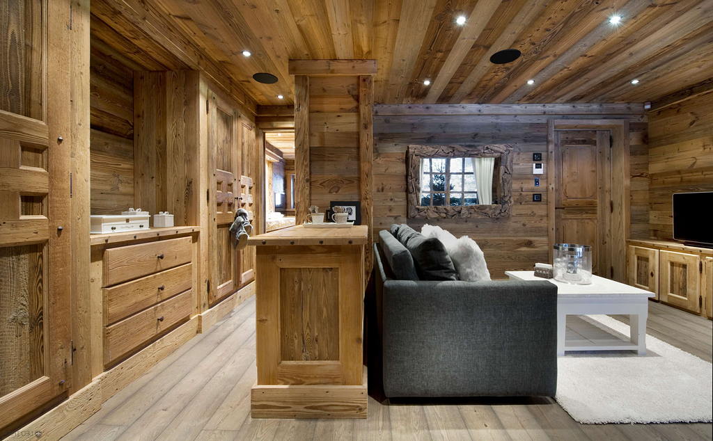 Для избегания монотонности в интерьере одна из стен выкладывается досками горизонтально, что создает интересный визуальный эффект. Очень часто в рамках шале происходит комбинация разнообразных приемов облицовки, фактур и текстур.