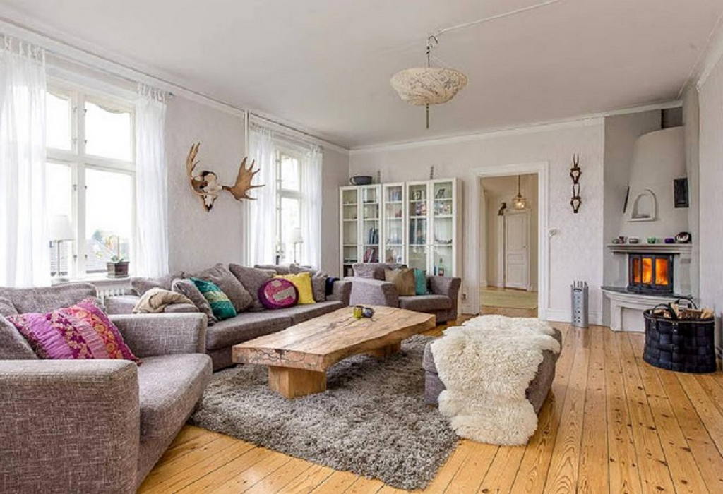 Какой бы вариант не выбрал владелец коттеджа, гостиную комнату лучше делать в едином для обоих направлений стиле. Это обязательно должна быть самая просторная комната с высокими стенами.