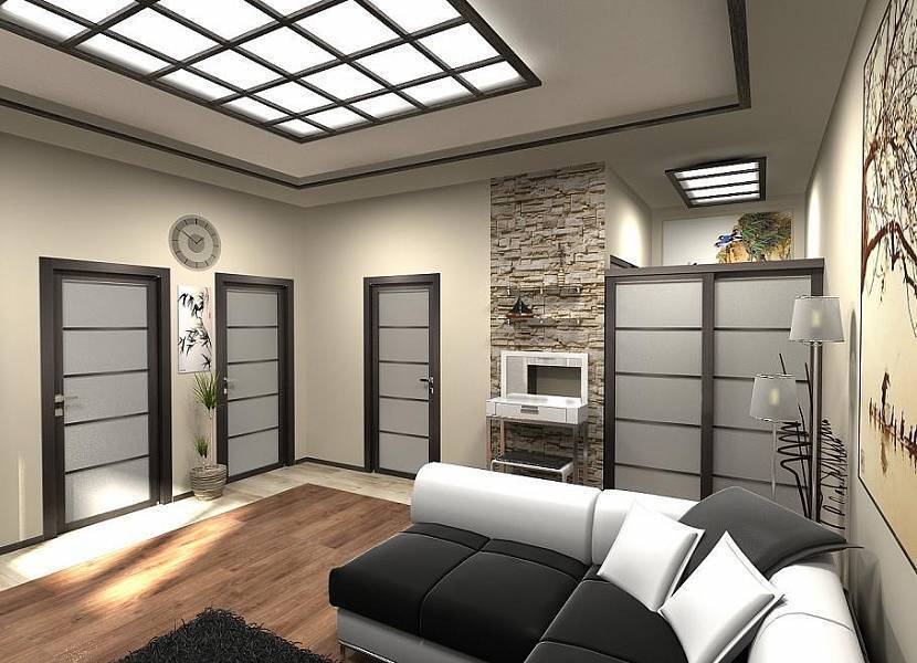 При оформлении потолка по японскому стилю важно сохранить простоту, строгость и лаконичность. Например, при использовании натяжного потолка, выбирают натяжное полотно мягких оттенков матовой фактуры