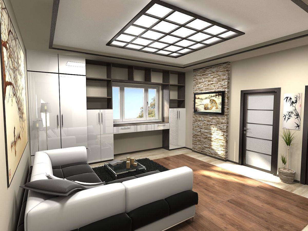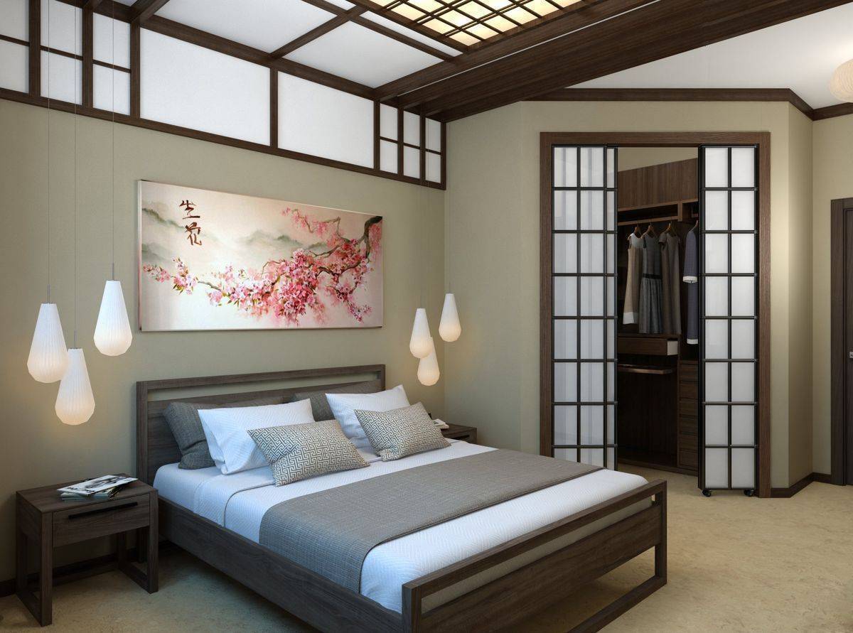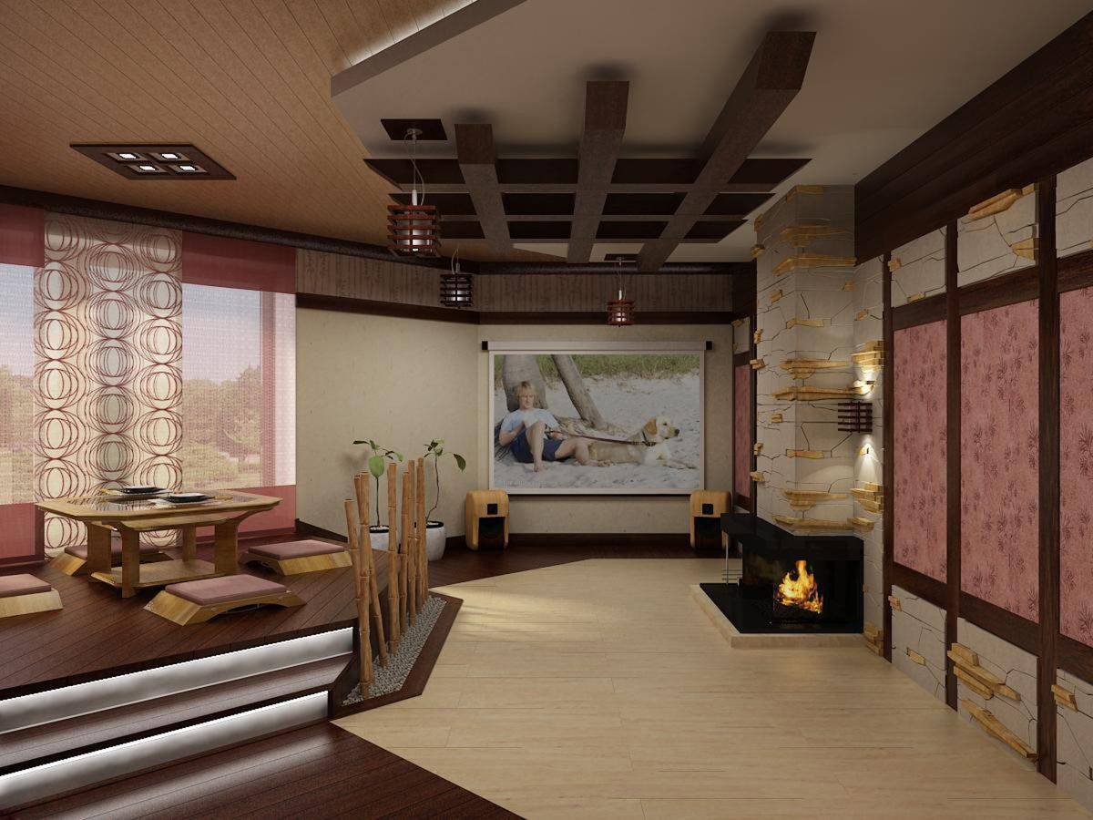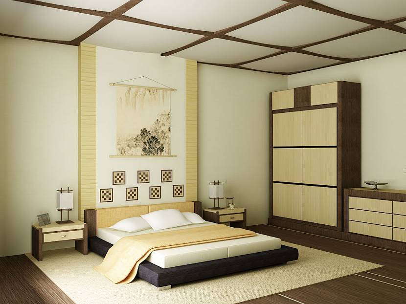 На потолке желательно оборудовать балки, а особое внимание уделить освещению. Тогда у вас получится комната с европейским комфортом и японским настроением