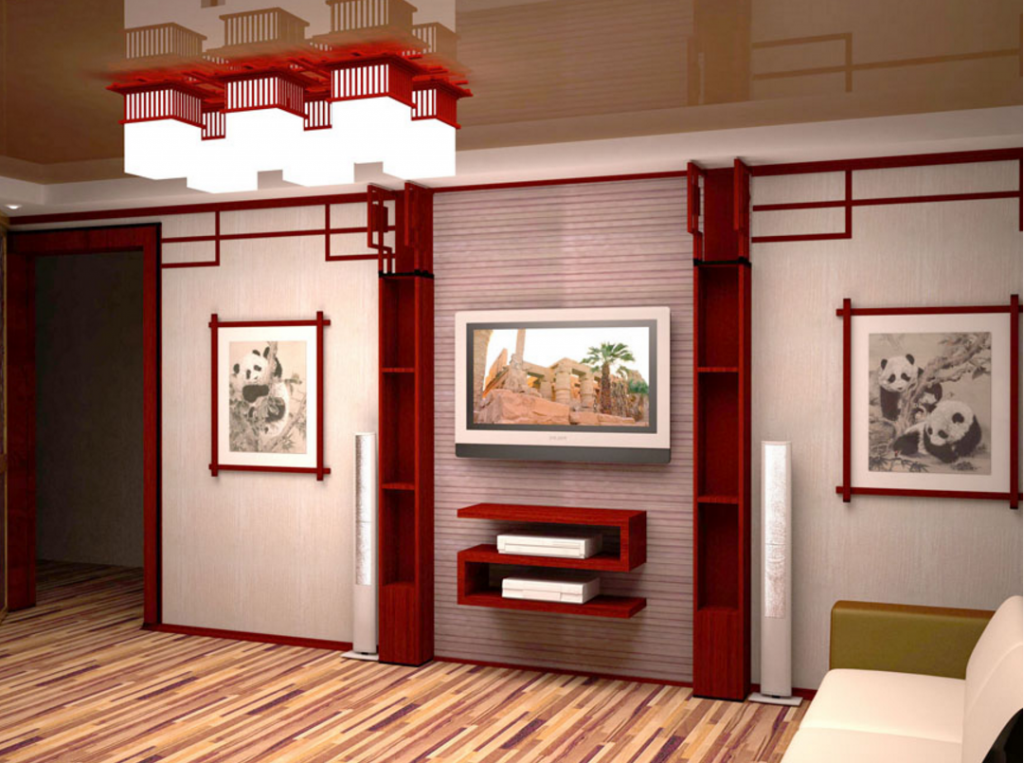 Дополнить декор помогают характерные для Китая рисунки, стены украшают картины и панно с изображением иероглифов.
