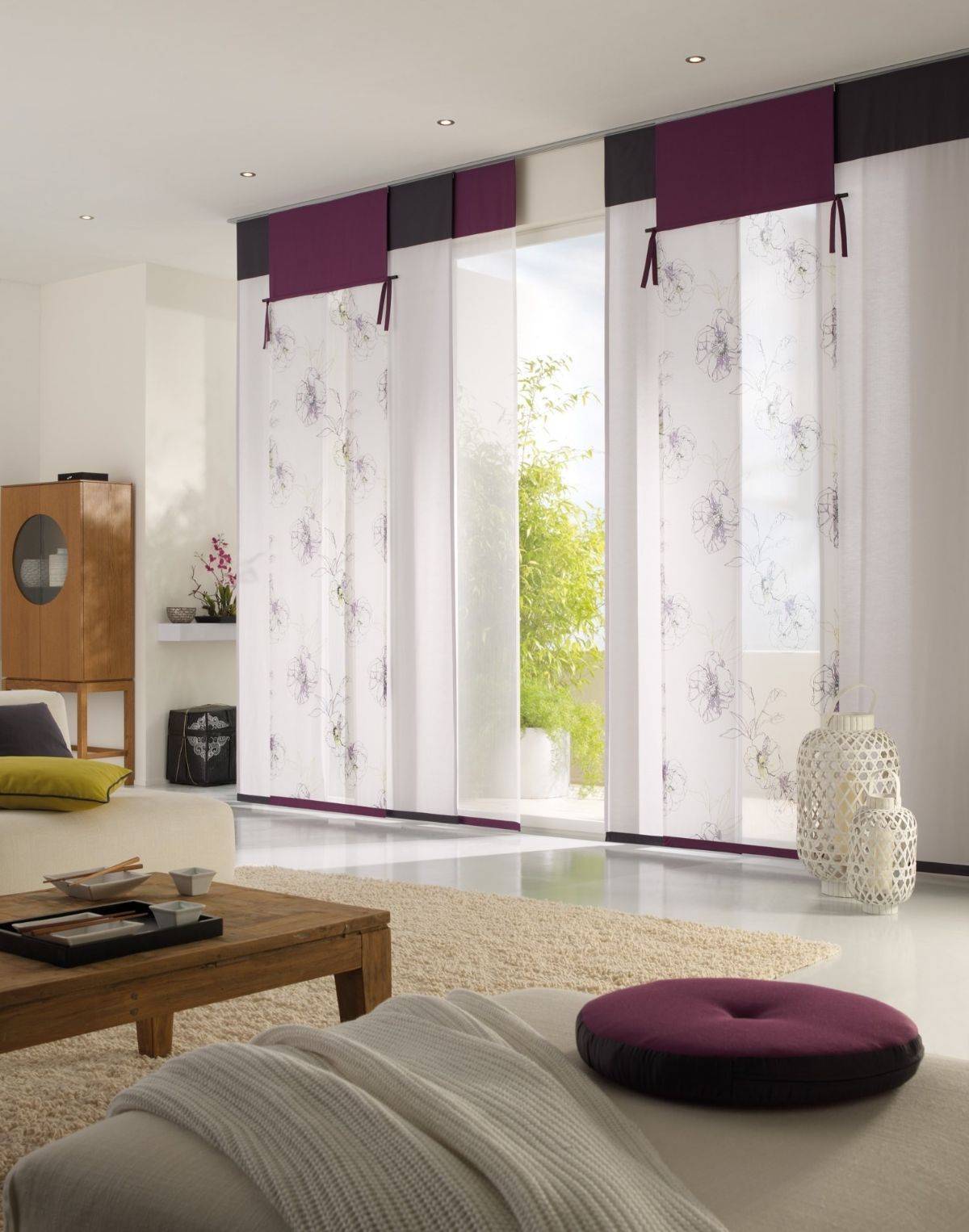 Такие шторы являются воплощением японского стиля, простоты и функциональности одновременно. В качестве материала часто используется лен или хлопок. Окна дополнительно декорируют бамбуковыми или деревянными жалюзи.