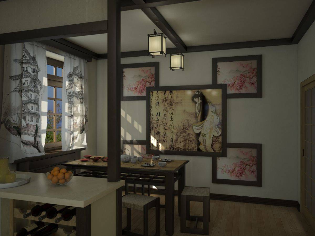 К особенностям японского оформления также можно отнести светлую цветовую гамму, ровные конфигурации, минимальное количество плавных форм. Для выделения восточной тематики многие декорируют кухонное помещение тематическими художественными полотнами, активно используют в декоре иероглифы.