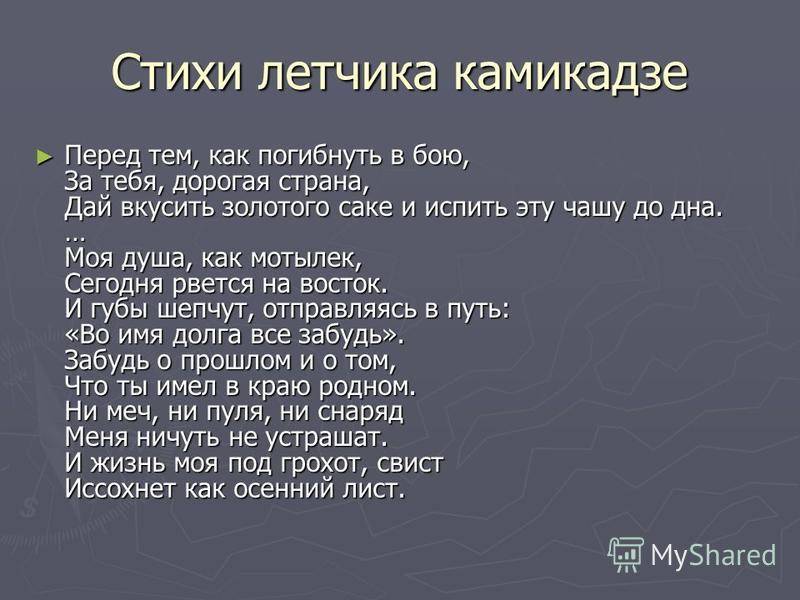 Стихи летчика камикадзе Перед тем, как погибнуть в бою, За тебя, дорогая страна, Дай вкусить золотого саке и испить эту чашу до дна. … Моя душа, как мотылек, Сегодня рвется на восток. И губы шепчут, отправляясь в путь: «Во имя долга все забудь». Забудь о прошлом и о том, Что ты имел в краю родном. Ни меч, ни пуля, ни снаряд Меня ничуть не устрашат. И жизнь моя под грохот, свист Иссохнет как осенний лист. Перед тем, как погибнуть в бою, За тебя, дорогая страна, Дай вкусить золотого саке и испить эту чашу до дна. … Моя душа, как мотылек, Сегодня рвется на восток. И губы шепчут, отправляясь в путь: «Во имя долга все забудь». Забудь о прошлом и о том, Что ты имел в краю родном. Ни меч, ни пуля, ни снаряд Меня ничуть не устрашат. И жизнь моя под грохот, свист Иссохнет как осенний лист.