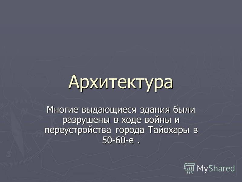 Архитектура Многие выдающиеся здания были разрушены в ходе войны и переустройства города Тайохары в е.