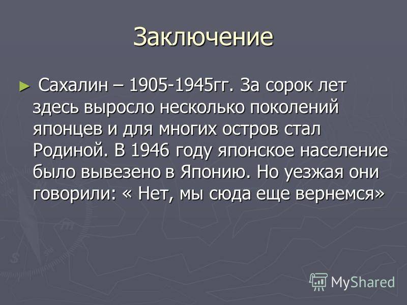 Заключение Сахалин – гг. За сорок лет здесь выросло несколько поколений японцев и для многих остров стал Родиной. В 1946 году японское население было вывезено в Японию. Но уезжая они говорили: « Нет, мы сюда еще вернемся» Сахалин – гг. За сорок лет здесь выросло несколько поколений японцев и для многих остров стал Родиной. В 1946 году японское население было вывезено в Японию. Но уезжая они говорили: « Нет, мы сюда еще вернемся»