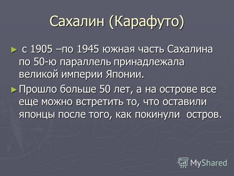 Презентация на тему: ” Японское наследие Сахалина. Сахалин (Карафуто) с 1905 –по 1945 южная часть Сахалина по 50-ю параллель принадлежала великой империи Японии. с 1905 –по.” — Транскрипт: