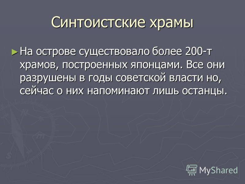Синтоистские храмы На острове существовало более 200-т храмов, построенных японцами. Все они разрушены в годы советской власти но, сейчас о них напоминают лишь останцы. На острове существовало более 200-т храмов, построенных японцами. Все они разрушены в годы советской власти но, сейчас о них напоминают лишь останцы.