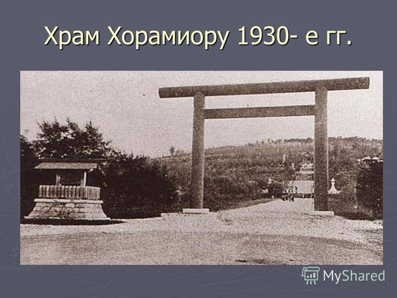Храм был посвящен японскому майору Нисикубо, погибшему в ходе боевых действий во время Русско-японской войны. До наших дней от храма дошел только сам памятник “тюррейто”, на котором высечен список погибших японских солдат. Также рядом можно увидеть стелу с “автографом” японского военачальника – генерала Коуити Нобори. Тогда в Японии существовал обычай — наносить на подобные памятники надписи, сделанные известными военачальниками.
