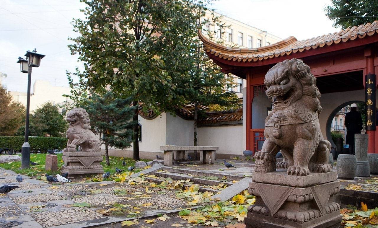 Каменные львы. Традиционный атрибут китайского сада, призванный защитить хозяина от отрицательной энергии, которую могут принести с собой посетители. Располагаются парами непосредственно у дверей дома или перед входными воротами.