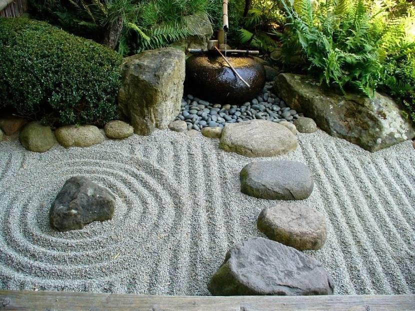 Камень в восточной философии является символом стабильности, силы и вечности. Обязательно должен присутствовать в качестве основного элемента декора. С помощью камней можно подчеркнуть структуру, грамотно расставив их на определенных местах. Помимо этого, каменные элементы могут быть частью дорожек, мостиков или пруда. Рекомендуется располагать асимметрично по всему участку.