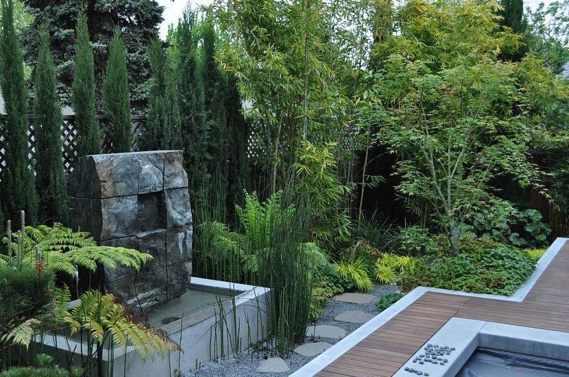 Японский. Дизайн завязан на традициях не только минимализма, но и символизма; цель японского дизайна — добиться природной гармонии в сочетании четырех материальных и одного духовного элемента. Одним из главных элементов в японском саду является камень. Это поясняет обязательное присутствие если не сада камней, то, возможно, каменных россыпей сухого ручья, мощеной дорожки из натурального камня или каменной отсыпки.