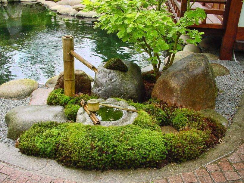 Для японцев она имеет сакральное значение. Символизирует жизнь, развитие и процветание. Является ключевым элементом декора. Это могут быть искусственные или естественные источники, однако сама вода обязательно должна быть настоящей. Именно она задает общий ритм и настроение всего сада, поэтому рекомендуется использовать движущиеся объекты – ручей или фонтаны.