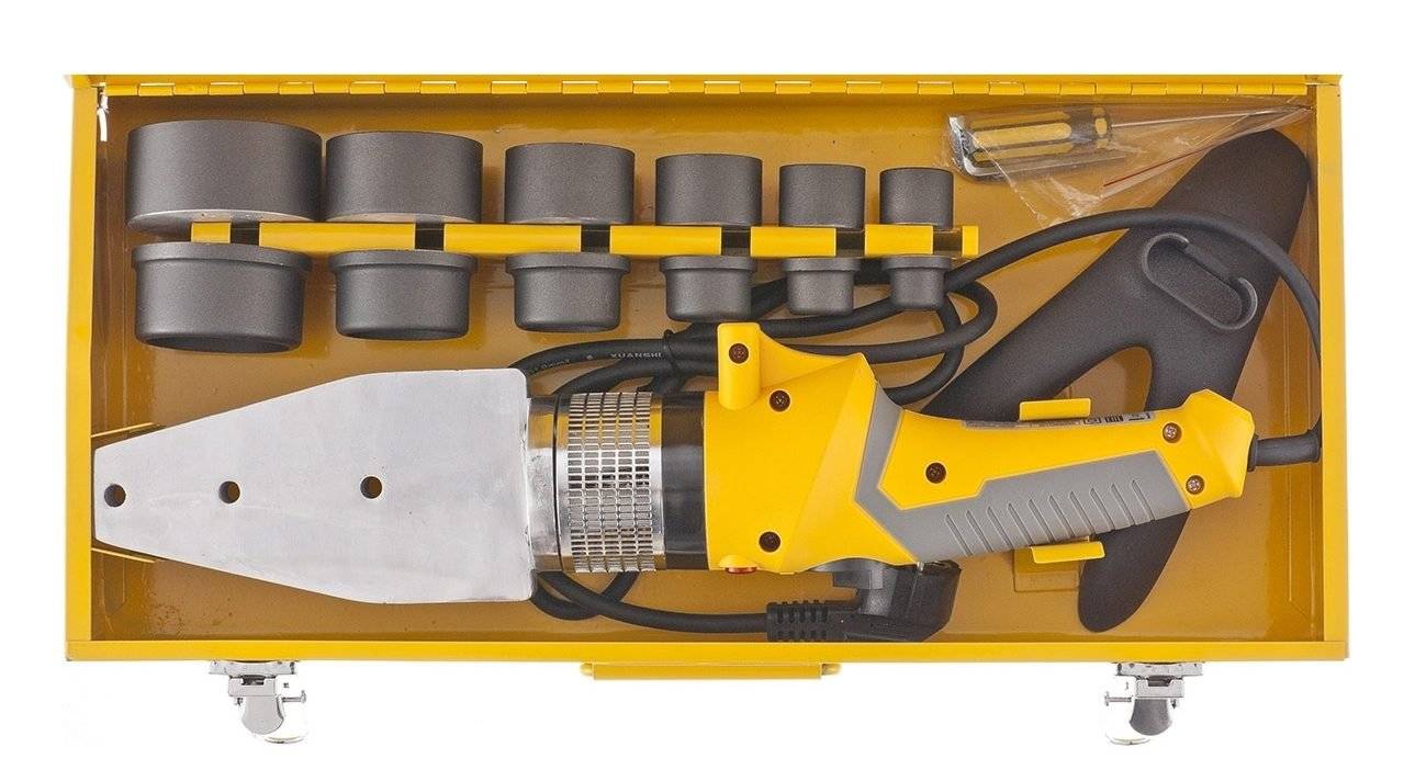 Регулятор температуры позволяет устанавливать два значения. В комплекте набора три насадки – 16, 25, 32 мм. Мощность нагревателя 1,5 кВт. В отзывах пользователей отмечается ненадежность термостата. Но в то же время хорошо развита сеть сервисного обслуживания.