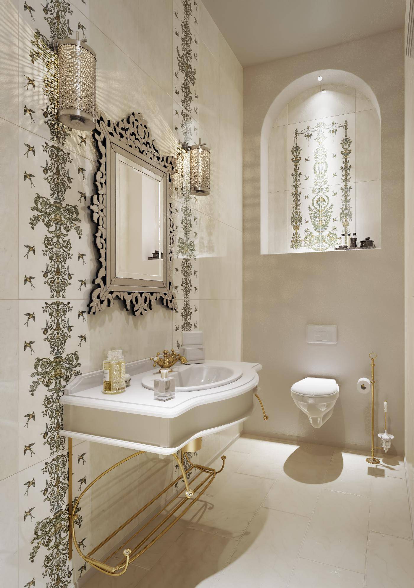 Единственное помещение, которое отличается материалами для отделки стен – это ванная комната в арабском стиле. Здесь принято использовать плитку или мозаику, создавая невероятные по красоте орнаменты из небольших керамических элементов.