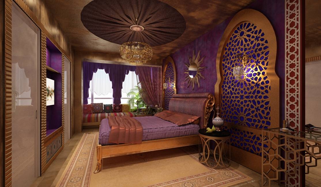 Спальня в арабском стиле наполнена богатством, в центре помещения находится большая кровать, её можно дополнить балдахинами, подушками, покрывалом. Деревянное изголовье, резные детали, инкрустация, арки, ковры. В таком помещении нет места телевизионной технике, здесь нужно отдыхать, расслабляться и набираться сил.