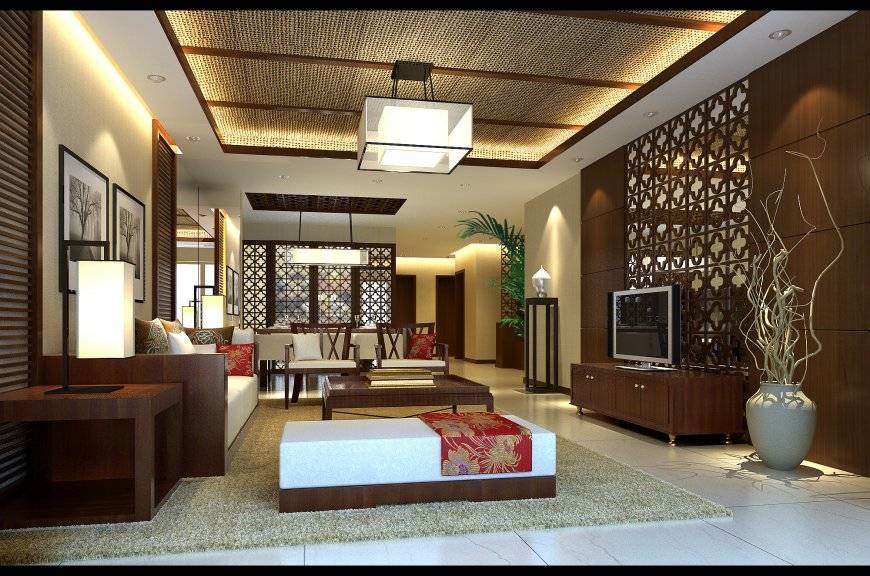 Если же в гостиной чаще собираются члены семьи, необходимо позаботиться об их удобном нахождении в этой зоне. Для сохранения самобытности восточного стиля, телевизор можно спрятать в специальной нише. Не стоит забывать о характерных элементах декора, мебели и аксессуарах.