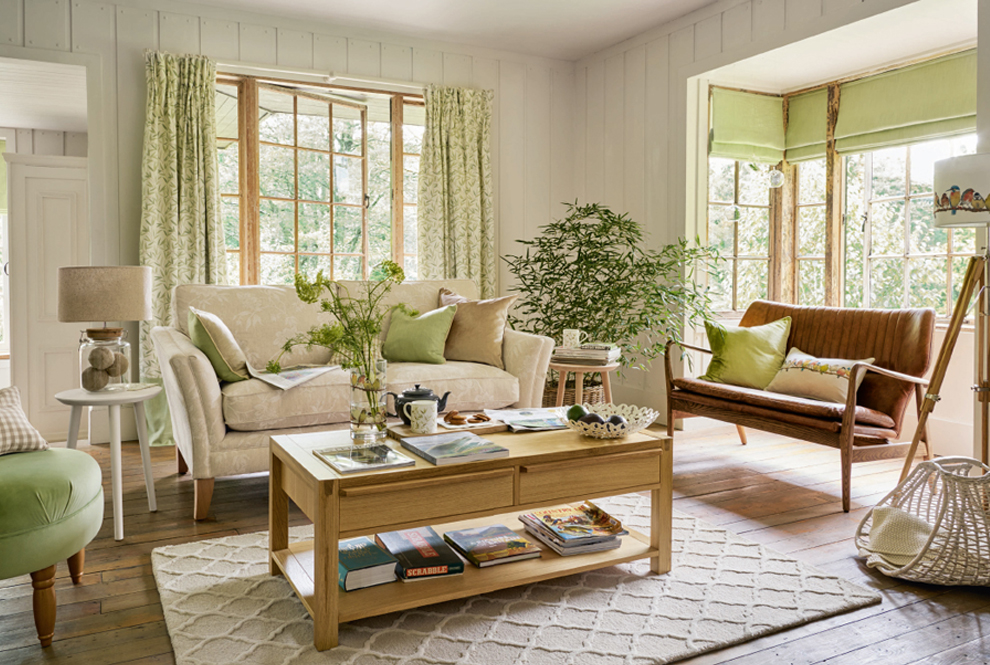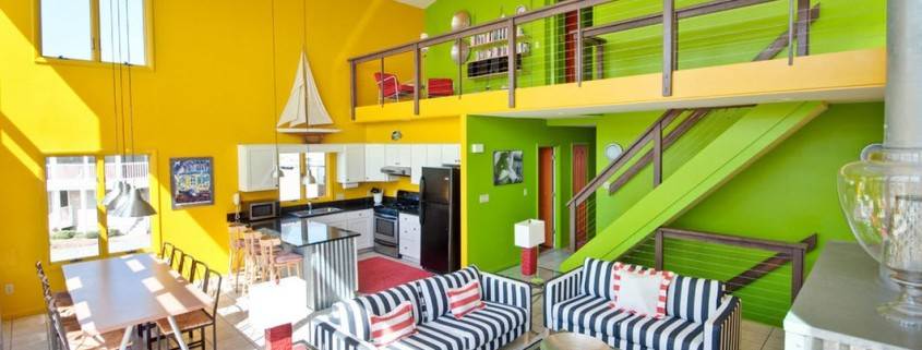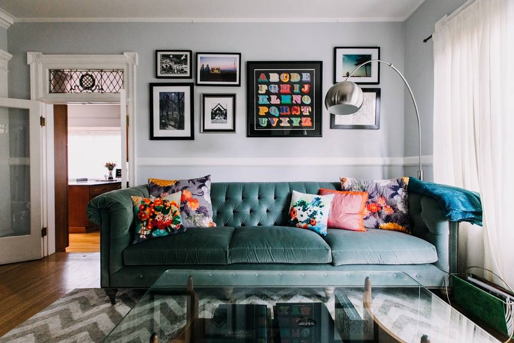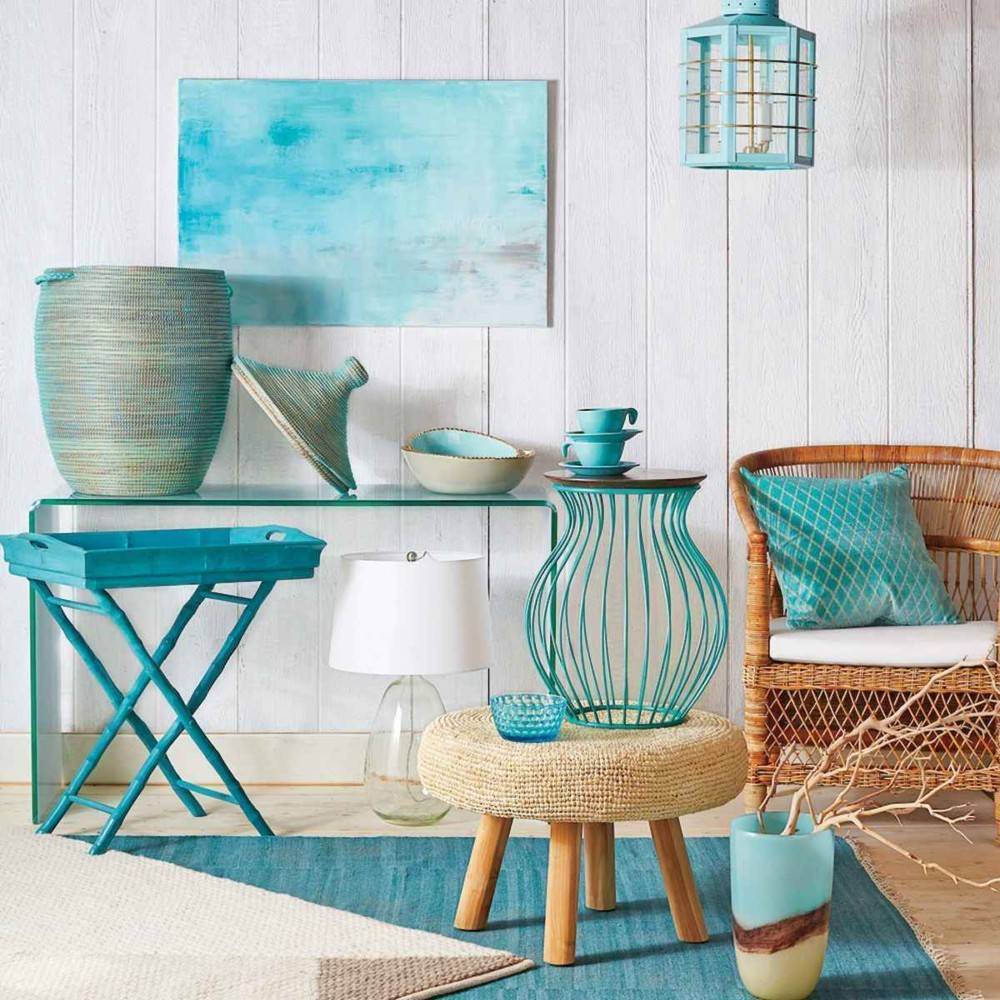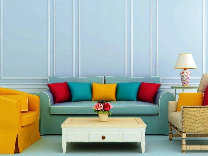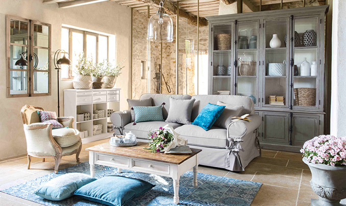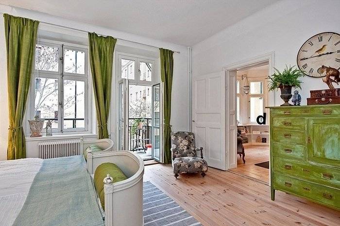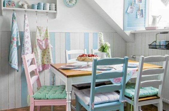 А вот на мебели обычно делается акцент, поэтому она часто выполняется светло-голубым, салатовым, оливковым, светло-оранжевым или охряным цветами. А завершающим штрихом в таком интерьере станет цветной текстиль.