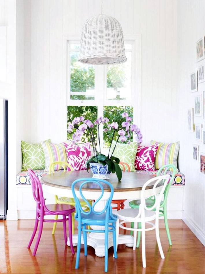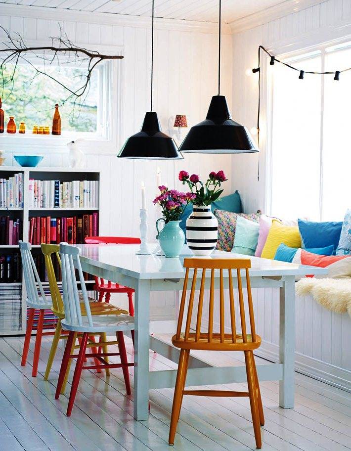 Яркий стол — покупать его необязательно, можно просто выкрасить в понравившийся цвет старый деревянный стол. Вариантов оттенков множество: синий, зеленый, голубой, желтый. Цвета можно комбинировать, например, подобрать к столу синего оттенка желтые или оранжевые стулья. Вариант с ярким столом отлично подходит для обустройства кухни-гостиной.