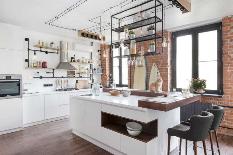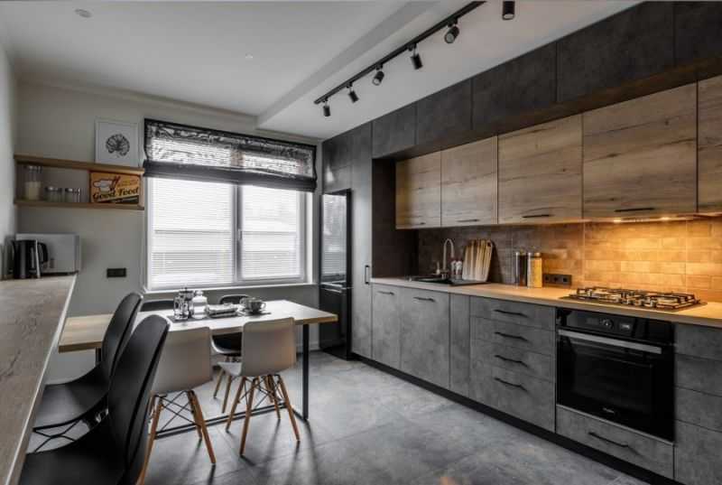 Современной кухне – современные материалы. Отделка любая: индустриальная кирпичная кладка лофта или обои – нужно лишь брать в расчет необходимость ухода (ровную поверхность проще протирать, нежели фактурную). Пол выложите плиткой, камнем или паркетной доской – все эти материалы ударопрочные, но в последнем случае в обязательном порядке должно быть влагоотталкивающее покрытие.