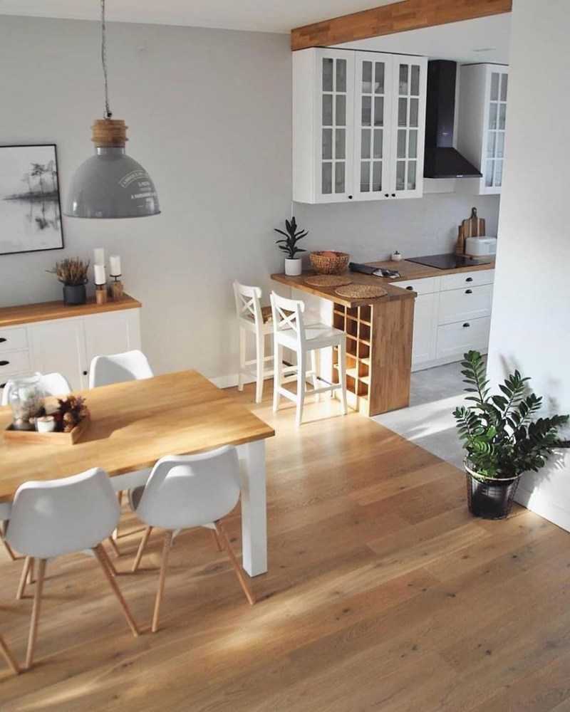 Мебель в скандинавском стиле характеризуется сдержанностью и простотой. Обычно выполняется из дерева. Столешница и другие предметы, как правило, деревянные, что придает комнате уюта. Фартук и рабочая зона преимущественно однотонные и оформляются плиткой или керамикой. Пол предпочтительно застелить ламинатом или досками. Эффектно будет смотреться контраст светлых стен и темного дощатого пола.