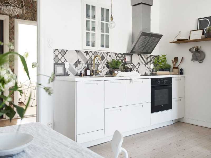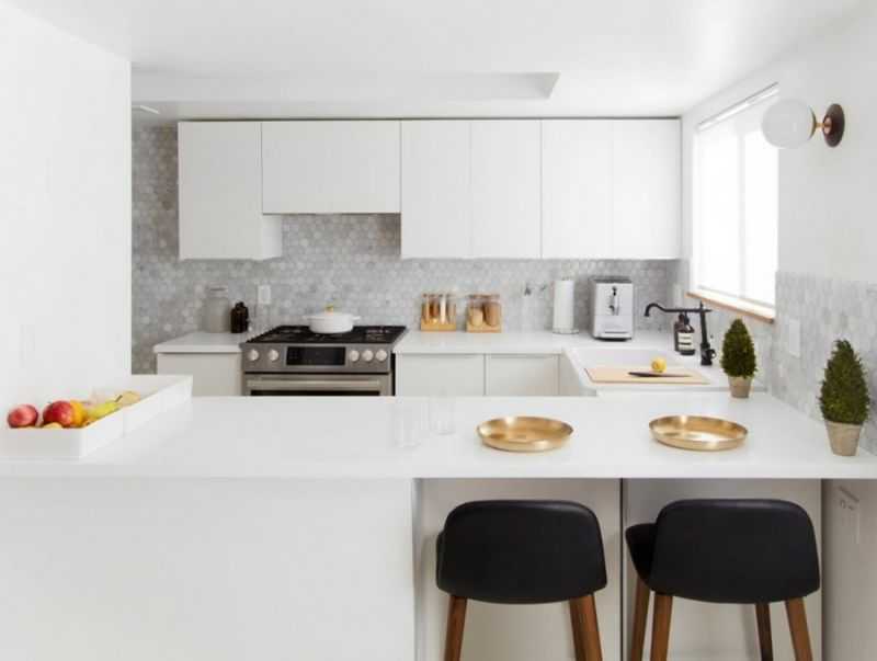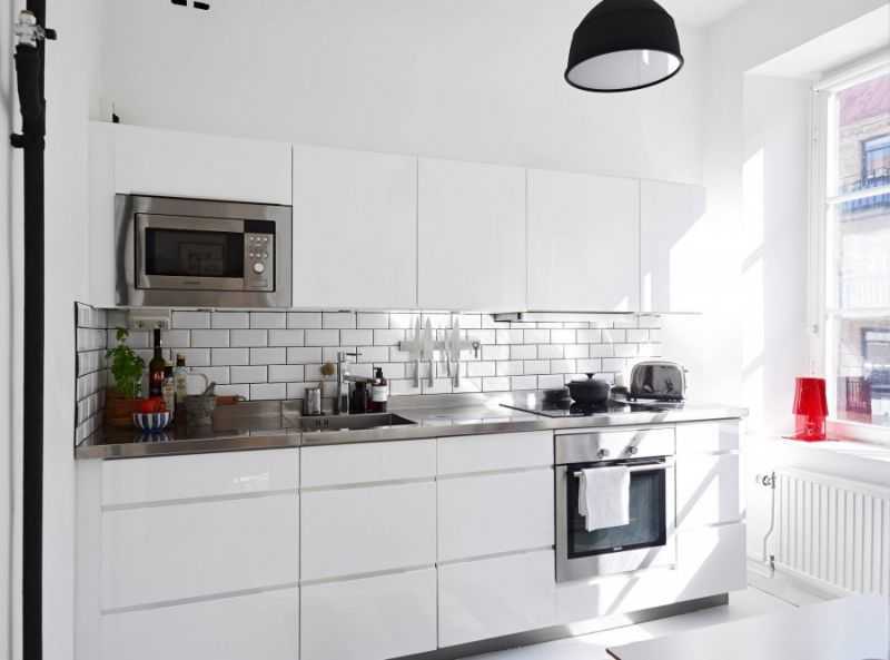Поиграйте с цветами, сделав столешницу контрастного цвета или установив скинали с ярким принтом. Этими акцентами можно отлично разнообразить общий монохром помещения.