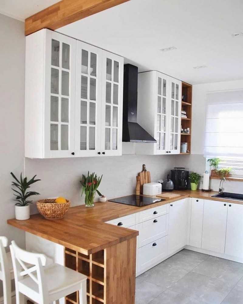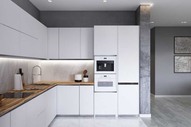 В таких кухнях хорошо смотрится высокая стенка. Места для хранения добавляются, соответственно на таких кухнях все будет на своих местах, порядок гарантирован.