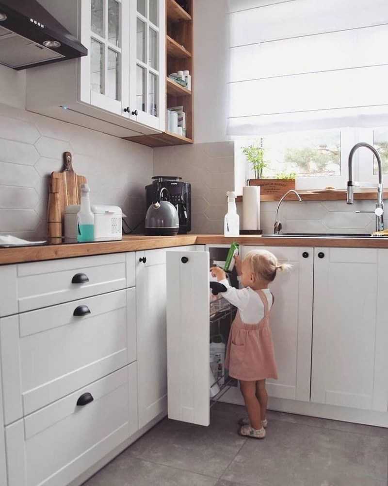Не захламляйте рабочую зону, чтобы для готовки всегда оставалось свободное место. Большую часть часто используемых предметов (столовые приборы, посуду, кастрюли, банки с крупами) нужно хранить в шкафах рядом с плитой. В рабочей зоне на рейлингах можно оставить только бумажные полотенца и баночки со специями.