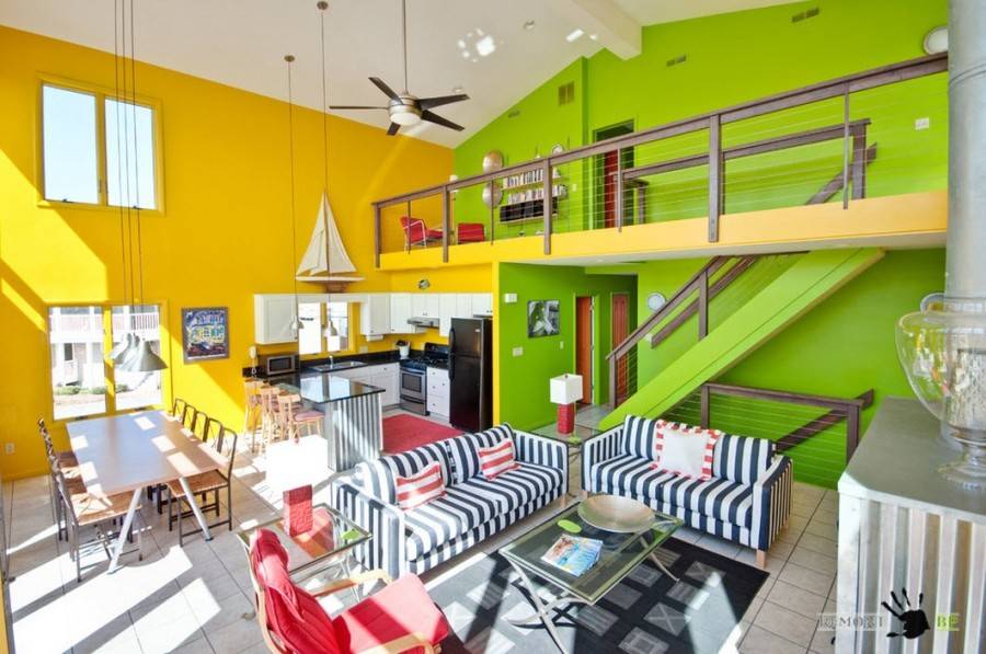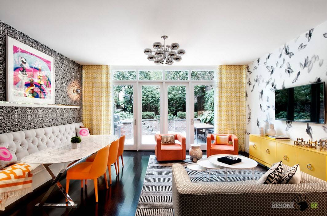 Идеальное решение — оклеить яркими обоями одну из стен. Следует подобрать подходящий орнамент, который будет гармонировать с основным цветом интерьера. Яркие обои подойдут для оформления помещений в стиле шебби-шик, хай-тек, артдеко. На фоне ярких обоев хорошо будут смотреться предметы мебели более приглушенных оттенков — белого, черного, коричневого, синего, серого цвета, а также цвета натурального дерева.