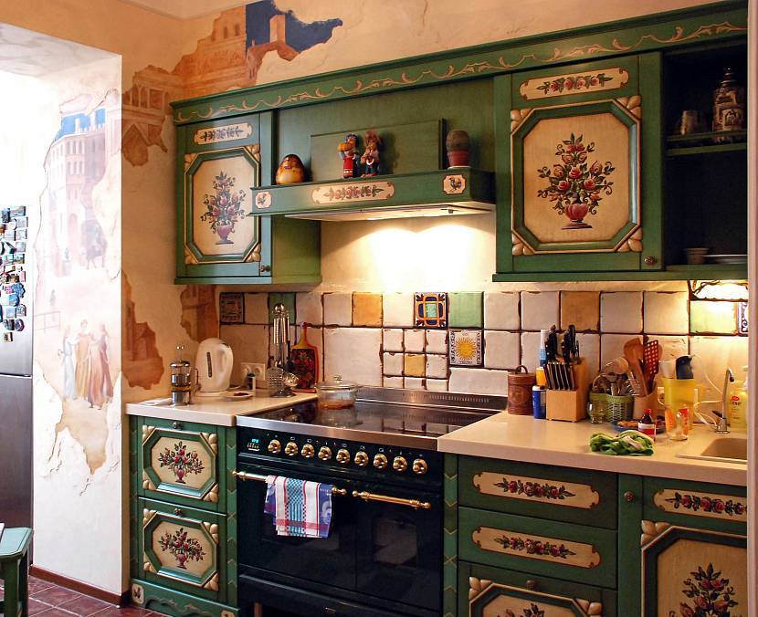 Декорирование кухни картинами, репродукциями или цветами характеризуют ее, как человека открытого, доброжелательного, приходящего на помощь в любой момент.