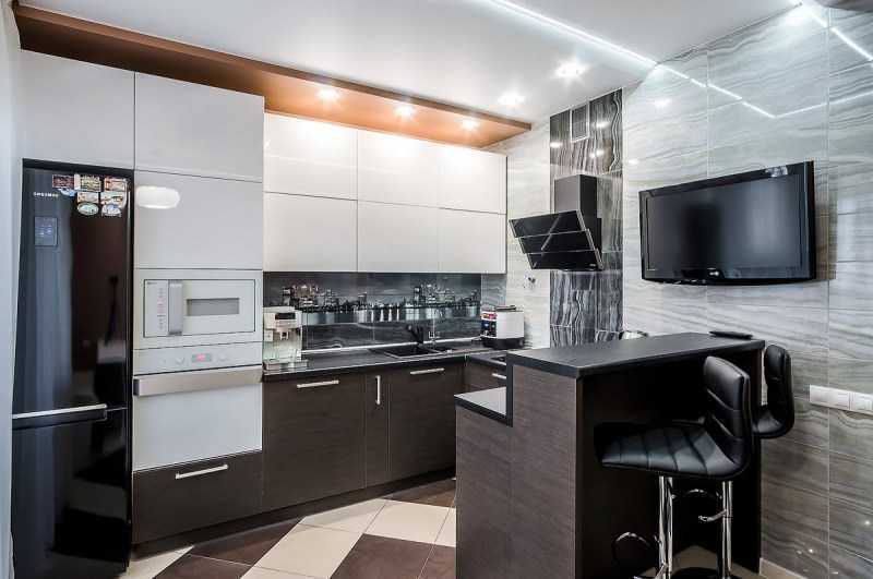 Мебель должна располагаться с учетом подвода коммуникаций: раковина там, где подвод воды, газовая плита, рядом с газовой трубой. Можно сделать перепланировку под мебель, но это потребует лишних затрат, и не малых. При подборе мебели учитывают даже рост жильцов квартиры, чтобы удобство было максимальным. При наличии просторных площадей, эффектным штрихом будет установка барной стойки.