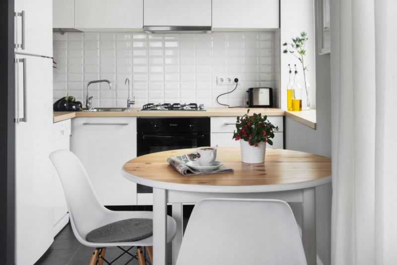 Если семья состоит не более, чем из двух человек, то для обеденной зоны можно выделить место на кухне. Например, переделанный в столешницу подоконник. К нему необходимо купить барные стулья, а лучше – барные табуреты, которые полностью задвигаются под столешницу, освобождая больше места.