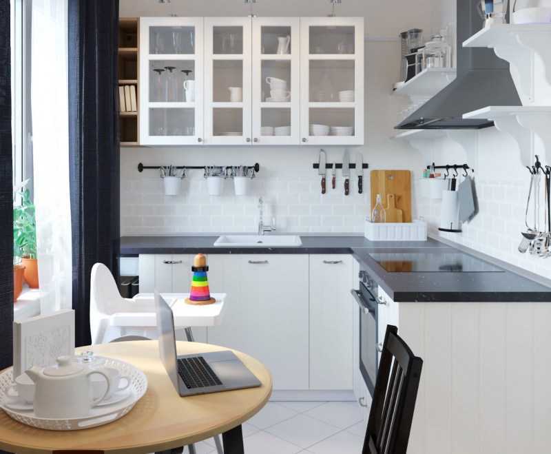 Вместо стандартных 60 см, можно заказать шкафы глубиной 35 см. При угловой планировке такое решение можно реализовать, установив узкие шкафы только на одной из сторон. Это некритично скажется на хранении.