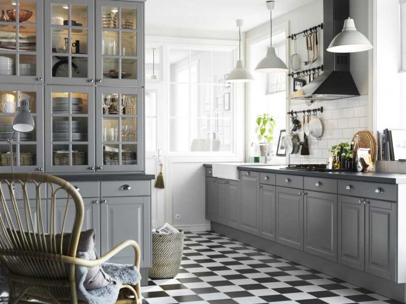 В качестве основного фона рекомендуется выбирать бежевый, белый, светло-серый, светло-голубой или светло-желтый цвет. Достаточно светлыми должны быть стены, потолок, гарнитур. В ярких тонах будут отлично смотреться кухонный фартук, нижние фасады, стол и стулья, аксессуары и декоративная посуда. Неплохое решение для отделки пола в такой кухне — черно-белая плитка в виде шахматной доски.