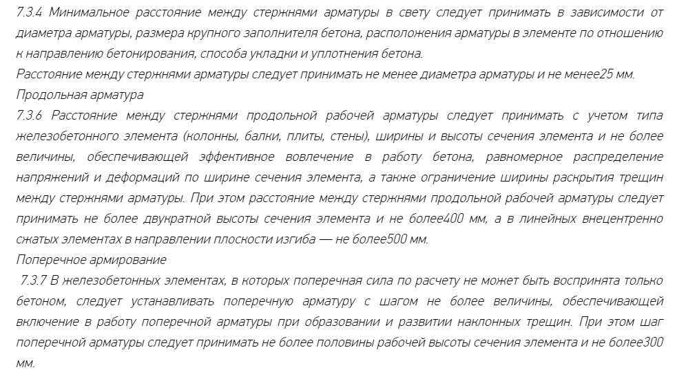 То есть она делает бетон работоспособным. В п. 7.3.6 СНиП 52-01-2003 указывается, что шаг между продольными армирующими прутами нужно рассчитывать исходя из их типа (стены, плиты перекрытия, балки, колонны), а также высоты и ширины поперечного сечения.