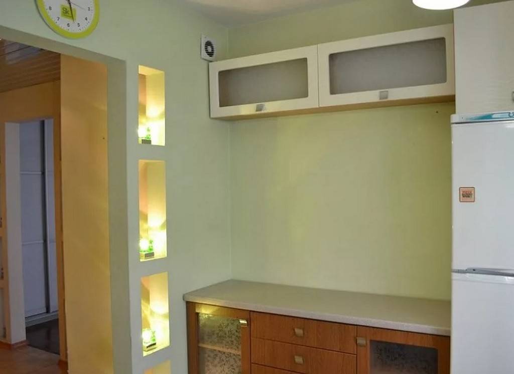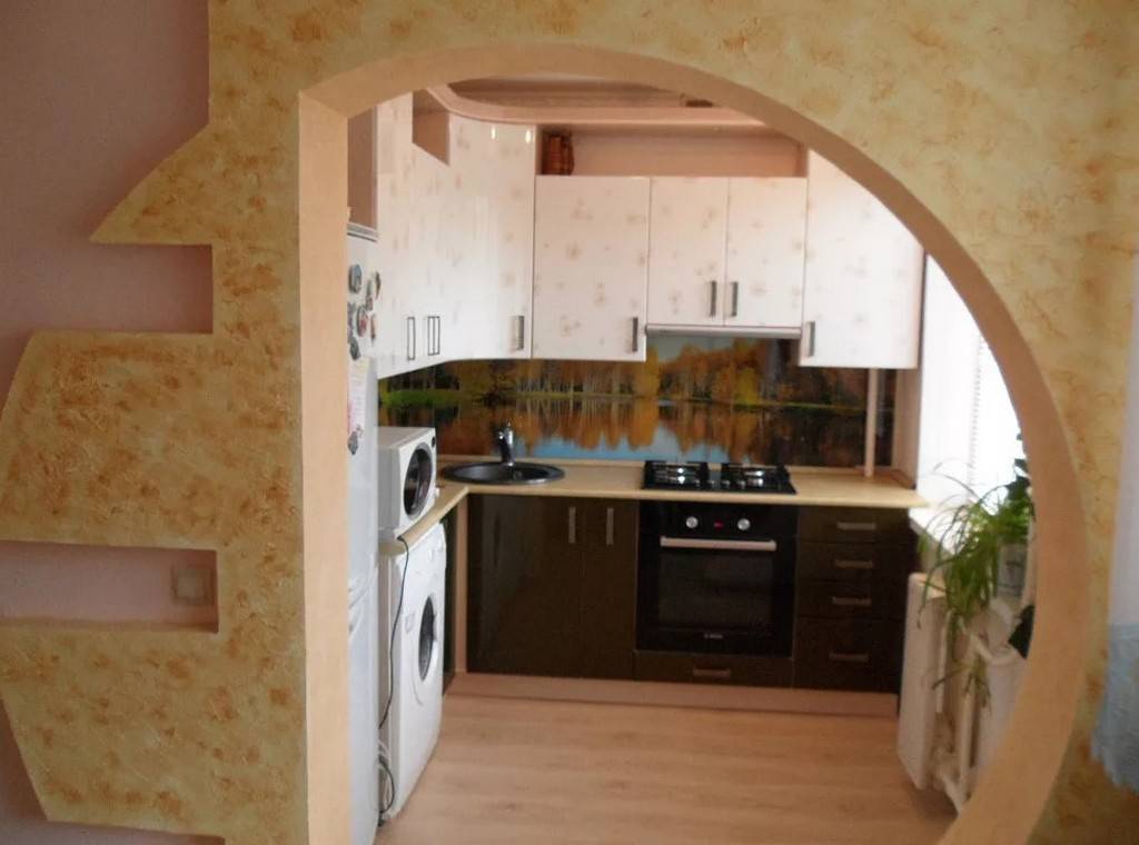 На фото можно увидеть как раз тот случай, когда квадратная арка на кухню вместо двери делает помещение более просторным.
