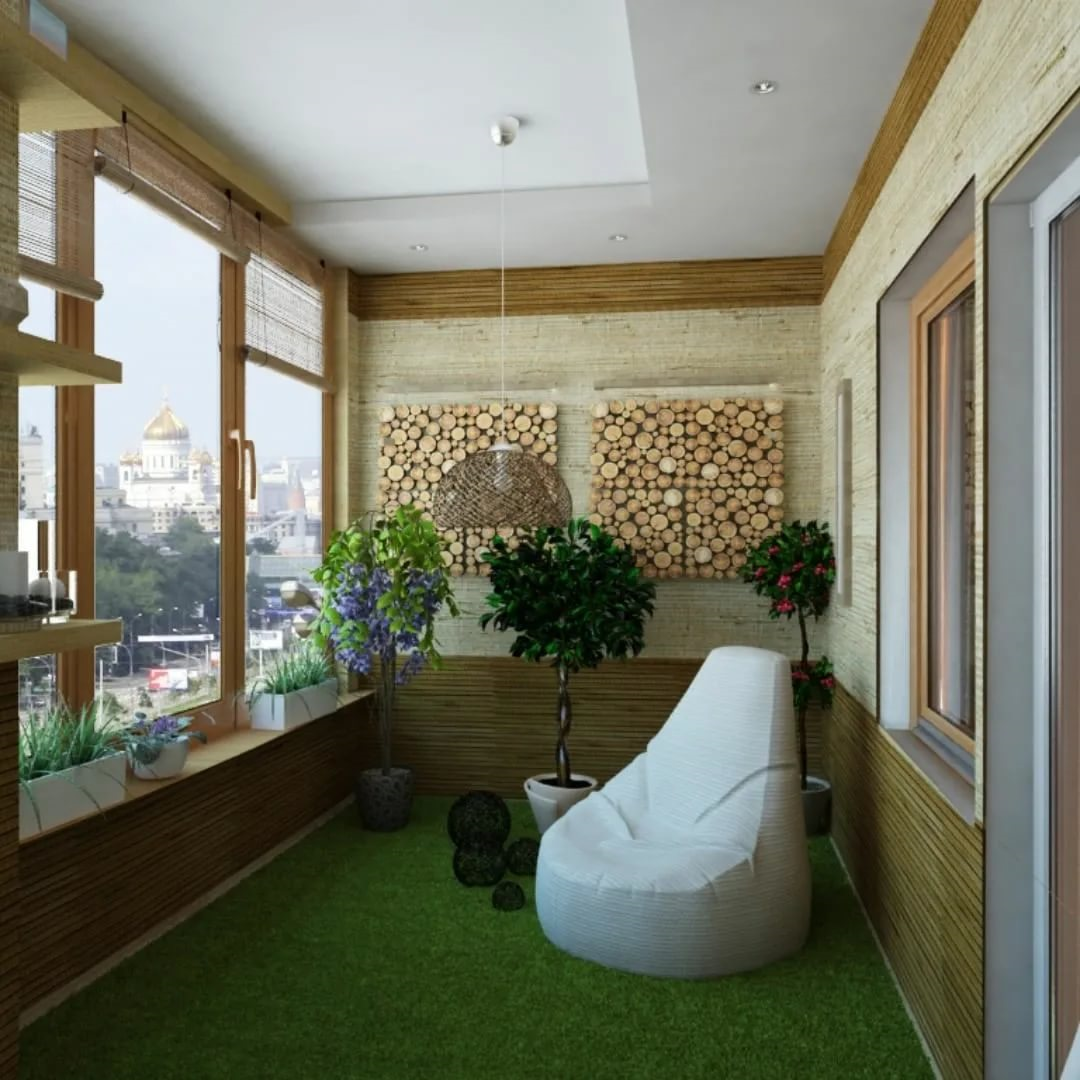 Имитация газона на полу оказывает успокаивающие действие. Искусственная трава при отделке балконов внутри продается полосками шириной от одного метра до 4-х и длиной достигает 25 метров. Пластины из армированной резины покрыты полимерным ворсом. Высота искусственной травы от 10 до 15 см, плюс ворс отличается по жесткости. Такое покрытие можно использовать только в качестве декора, разместив под кресло или диван, а можно покрыть весь пол.