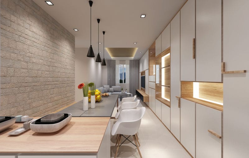 В рабочей зоне фартук закрыли скинали из прозрачного высокопрочного стекла. Мойку установили возле стены, остальная бытовая техника заняла боковой модуль. Освещает кухонный уголок точечная потолочная подсветка.