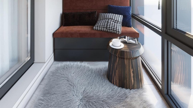 Ковролин из синтетического влагостойкого материала — популярное покрытие для отделки балкона, выпускаемого в рулонном виде. Чаще всего он изготавливается однотонным без ярких рисунков. Дизайнерские возможности с ковролином очень широки, а также плюсом будет его способность гасить шум и теплоизоляционные качества. Если помещение балкона не очень большое, то покрытие можно положить одним куском, закрепив плинтусами, в противном случае, полотно приклеивается полосками. Ковер — дорогая альтернатива ковролина при отделке внутри балкона, но в этом случае интерьер обретает отменный внешний вид, к тому же ковер подходит для крепления на стены.