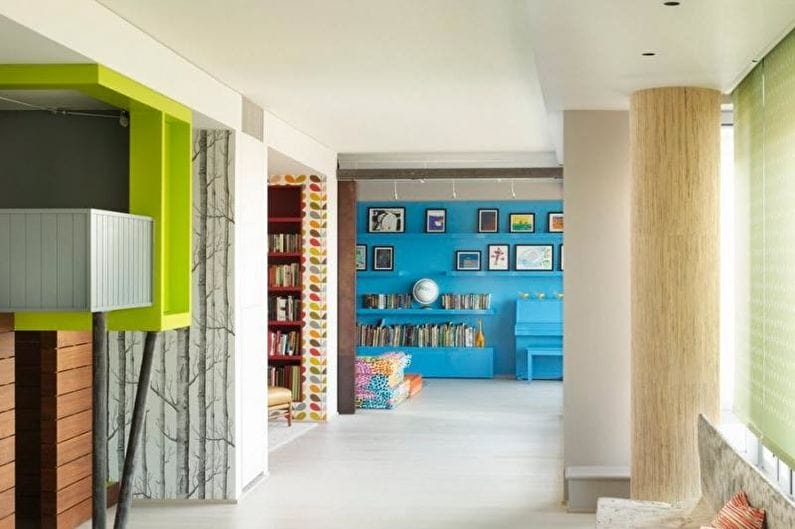 Интересное решение – разноцветные стены. В этом случае пространство соединяют предметом в углу, повторяющим оба цвета.