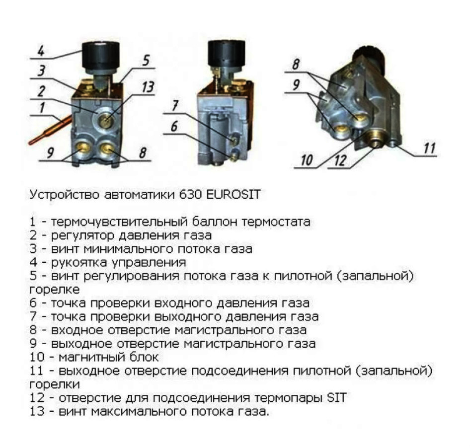 Ручка регулировки задает пороги срабатывания клапана в зависимости от давления, оказываемого датчиком. Если температура теплоносителя ниже установленной регулятором, то подача газа разрешается. При достижении максимально допустимого значения температуры подача газа прекращается.