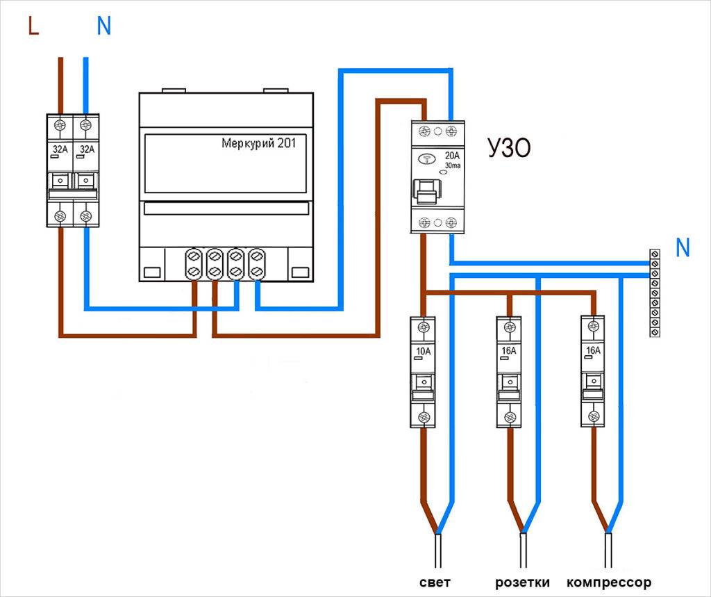 Как правило, фазный провод, обычно коричневого цвета, или тот, на котором индикатором определяется наличие фазы, заводится на вход электросчетчика, размещенного в щите электропитания, а затем на автомат защиты, размещенный в том же щите.После этого электросчетчик пломбируется для исключения воровства электроэнергии.