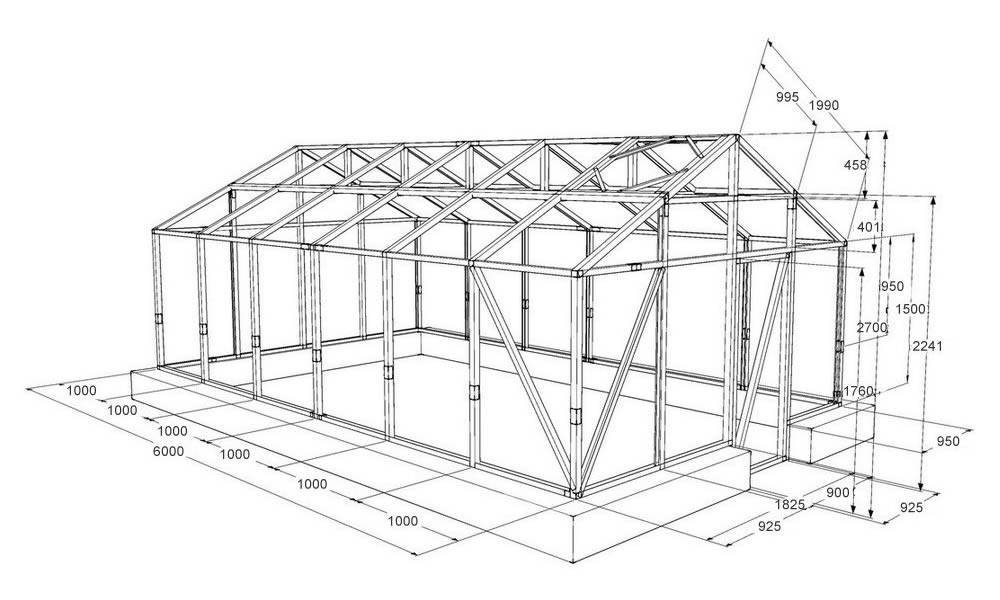 Чтобы при постройке двускатной теплицы использовать трубы по максимуму высота её стенки при угле наклона крыши 30 — 45⁰ выбирается равной 1,7 — 2 м, а ширина — 4 м. Длина ската составит 2,25 — 2,45 м. Перемычки устанавливаются в верхней точке дуг и в средней части скатов. На каждом боку по 2 штуки. Задняя стенка укрепляется двумя поперечинами. На фасаде размещается лудка (коробка, фрамуга) для двери. Исходя из её размера, подсчитывается количество вспомогательного профиля.
