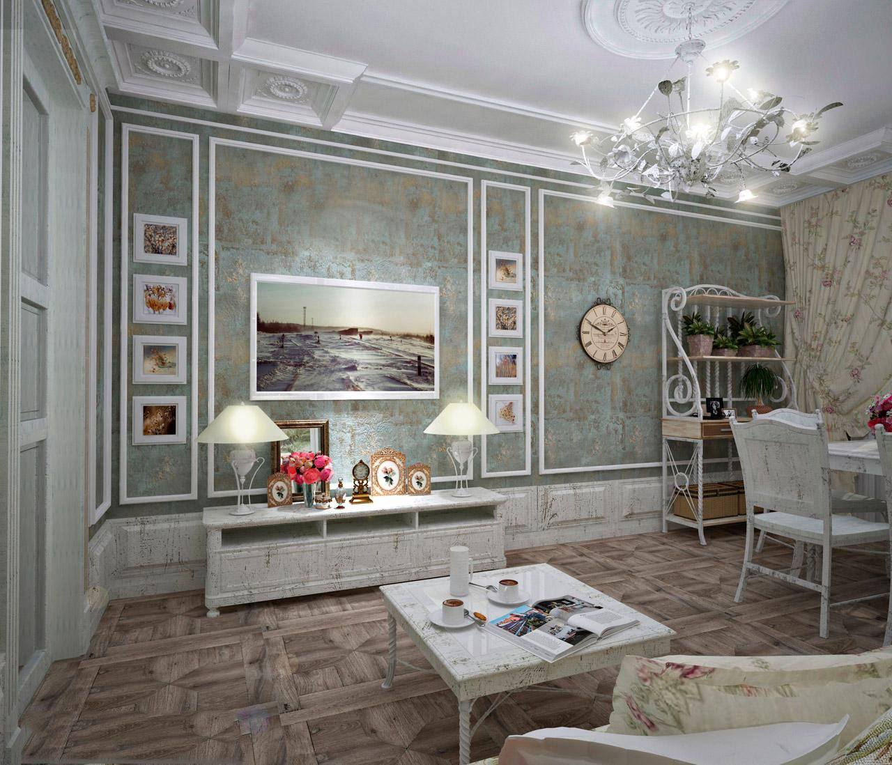 Стены в стиле прованс могут быть украшены деревянными молдингами, обрамляя полотно обоев по принципу картинной рамы.